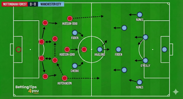 With the probable Forest structure, the first question is how high they want to defend. If they sit in a 4-4-1-1/4-2-3-1 block, the pressure points become clear: the spaces either side of Douglas Luiz and Anderson, and the channels between full-back and centre-back when City’s wide players start shifting defenders around. City will try to pull the block out of shape with short passes and rotations, then accelerate through the gaps with a quick third-man run or a through ball.