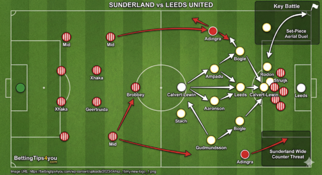 The most interesting tactical tension here is between Sunderland’s preference for width and Leeds’ vulnerabilities in wide defensive areas — and, at the same time, Leeds’ tendency to attack through the middle against a Sunderland side that can be comfortable without the ball.