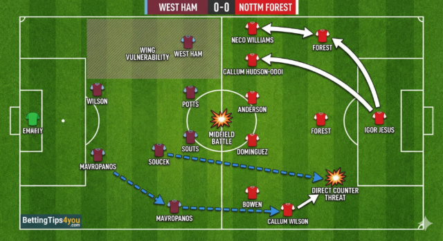 Full-backs decide the rhythm. Forest’s Williams and Savona push high to sustain attacks. West Ham’s Walker-Peters and Scarles spend most of the night defending deep. When West Ham bypass midfield with long balls, Walker-Peters and Bowen combine quickly to exploit the space Forest leave behind.